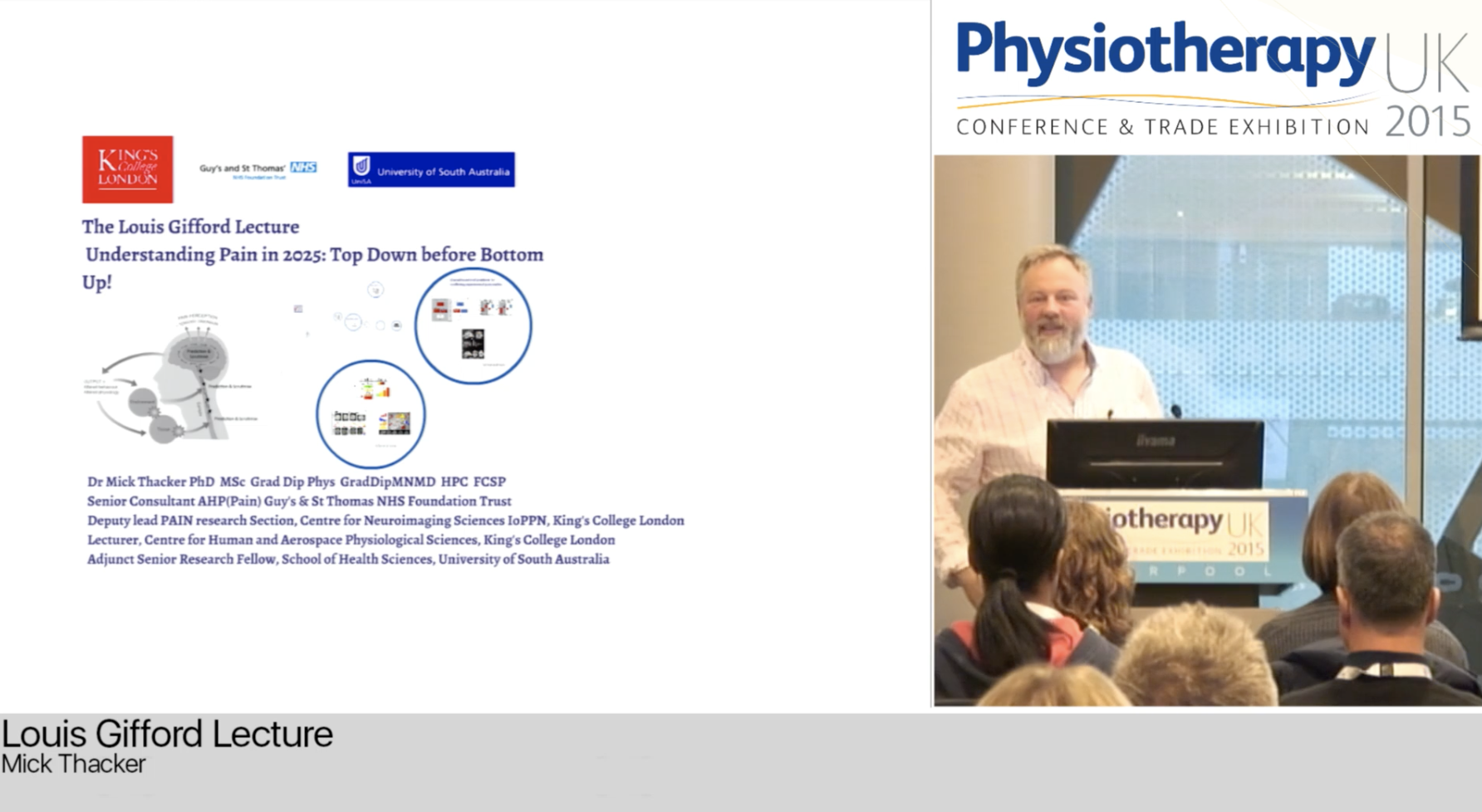 My sincere thanks here must go to Mick Thacker for giving his 2015 Louis Gifford Lecture talk the title Understanding Pain in 2025: Top Down before Bottom Up! and allowing a nice way to wrap this post up on an upswing, going back a few years to peer into the future. Discussing perhaps the most truly biopsychosocial (in Engel’s original formulation) model of pain around, Louis Gifford’s Mature Organism Model, Mick explores his own, embodied, formulation of the MOM, introduces the idea of Predictive Processing (PP), and discusses the work he is doing with one of the PP aficionados, Andy Clark, to take a PP approach to pain. Mick highlights along the way Louis’ prescient understanding of where pain science is heading, evident in his top down before bottom up maxim. Click on the image below for a link to the video. It’s long – but put aside the time, you’ll be smarter for having watched it.