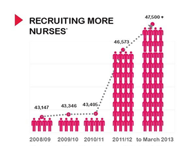 Inflated pictograms. The use of an icon to display data is a design flair, but can be used improperly to dramatise and mislead. These stick figures don’t match the numbers of nurses they claims to represent, providing a visual display of a 1000% increase, when the actual increase is about <10%.