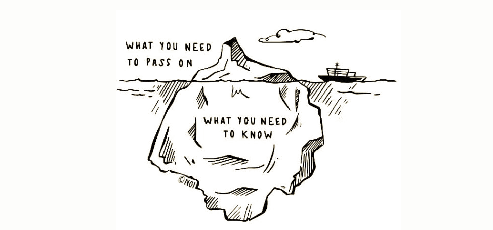 Another useful metaphor relating to the different kinds of knowledge is the iceberg. Functional knowledge – what you need to pass on – is just the tip of the iceberg, with declarative knowledge representing the 95% or more below the water. Motion is lotion requires the deliverer to understand the beneficial effects of movement on bodily structures, tissues and fluids, as well as tissue healing and progressive loading properties, in order to deliver the nugget.