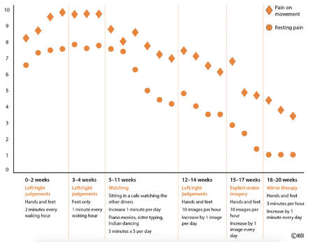 With pain levels trending upwards, Tim reduced Lucy’s training for the next two weeks to focus on just left/right discrimination of the feet for one minute of each waking hour, and nothing really changed – no better and no worse. Where do you go when just looking at images of hands during left/right discrimination makes the pain worse? Tim introduced some ‘motor empathy’ – asking Lucy to watch movies of people playing the piano, watch her sister’s hands as her sister typed at the computer and to watch other movements. Over seven weeks (weeks 5-11 above) Lucy’s pain ratings dropped and the watching therapy was progressed by increasing the time spent doing it and watching more functional activities.